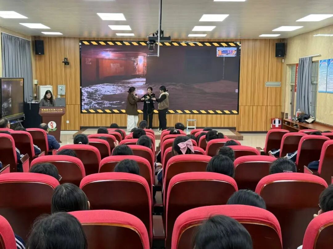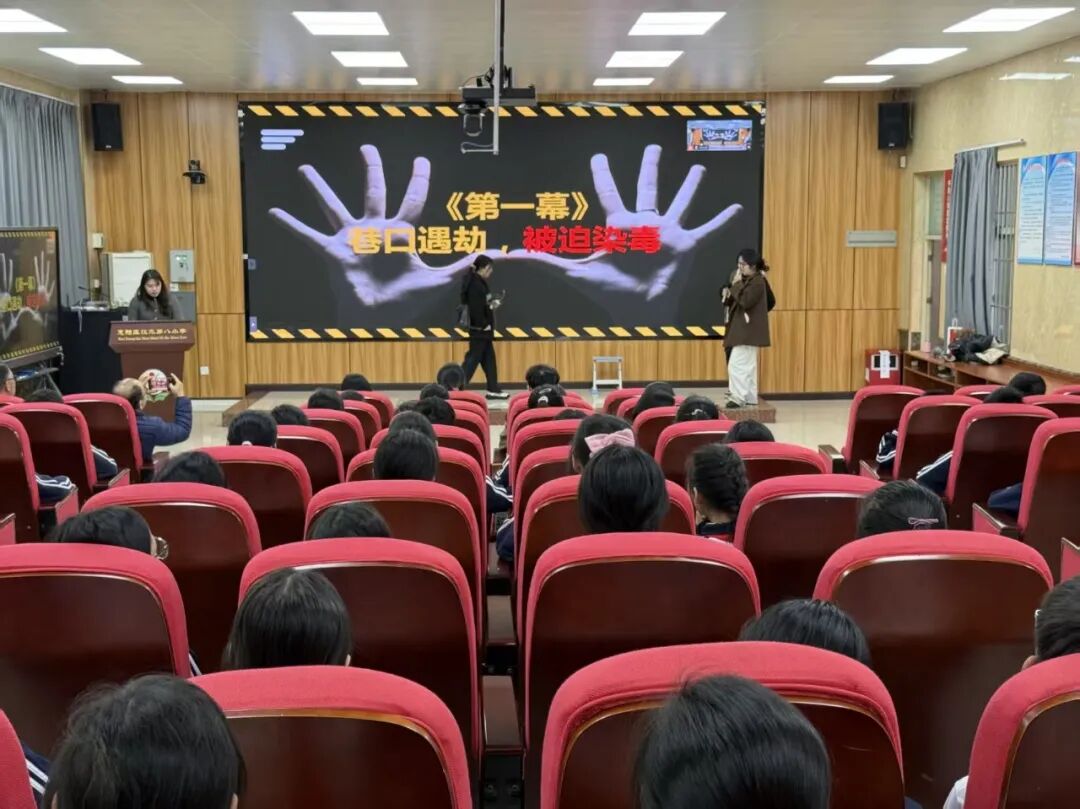 该剧深刻揭露了新型毒品“上头电子烟”如何以伪装和欺骗的方式侵蚀校园。剧中,本所律师化身剧中人物,真实再现了一名15岁初中生“小明”从被社会闲散人员以“尝鲜”“免费”为诱饵胁迫接触“上头电子烟”,到逐渐产生依赖,再到被毒贩引诱、险些踏入“以贩养吸”犯罪深渊的全过程。剧情层层递进,将毒品带来的短暂虚幻快感与随之而来的身体失控、精神依赖、家庭关系紧张以及面临的严峻法律风险刻画得淋漓尽致。当剧中“小明”在恐惧与挣扎中最终选择向父母坦白并报警时,全场响起了热烈的掌声,这掌声既是对剧中人迷途知返的肯定,更是同学们对是非善恶观的清晰共鸣。