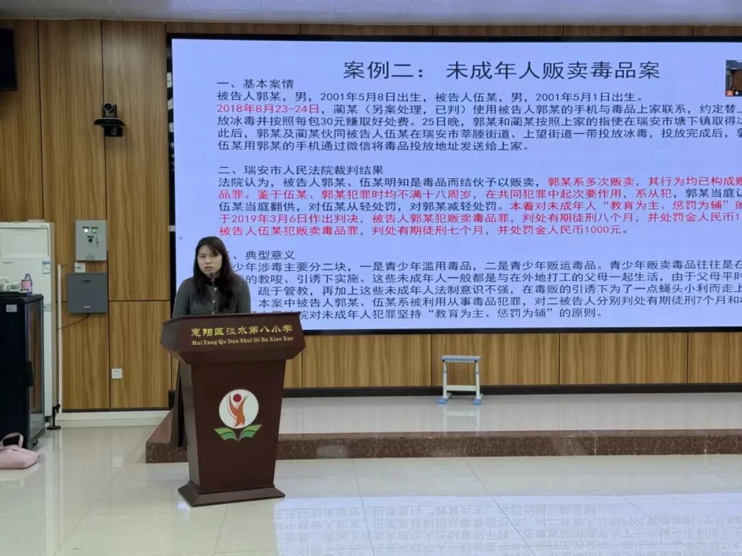 为切实增强青少年法治意识,提升其防范毒品侵害的认知与能力,2026年3月4日,在惠阳区司法局与团区委的组织下,广东金卓越(惠阳)律师事务所罗凯茹、吴宝威、黄璇、刘淑如、林文晶走进淡水第八小学,为同学们带来了一场别开生面、发人深省的2026年春季“开学法治第一课”。本次活动聚焦当前威胁青少年健康成长的新型毒品问题,以“沉浸式情景剧+专业法律讲解”的创新模式,将法律知识转化为生动体验,在学生心中筑起坚实的禁毒防线。